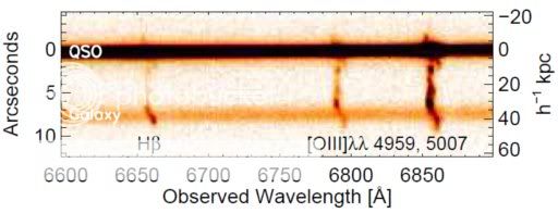In this pair (no one's given them a name yet, perhaps the Tumlinson duo?), the quasar is still active, and the tidal debris is beautifully lit up, as this 2D spectrum